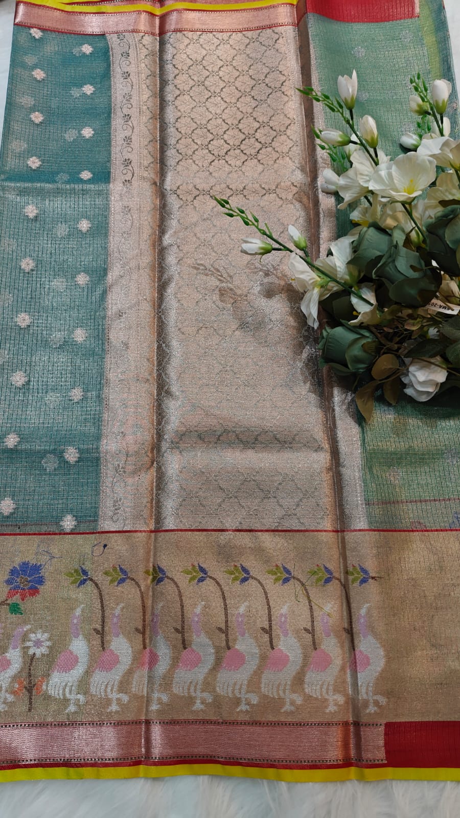 "This exquisite saree features a graceful fusion of traditions—crafted in fine Kota tissue, known for its lightweight, sheer texture and subtle shimmer, making it ideal for both day and evening occasions.The body is adorned in a DEEP TURQUISE hue, exuding opulence and charm.