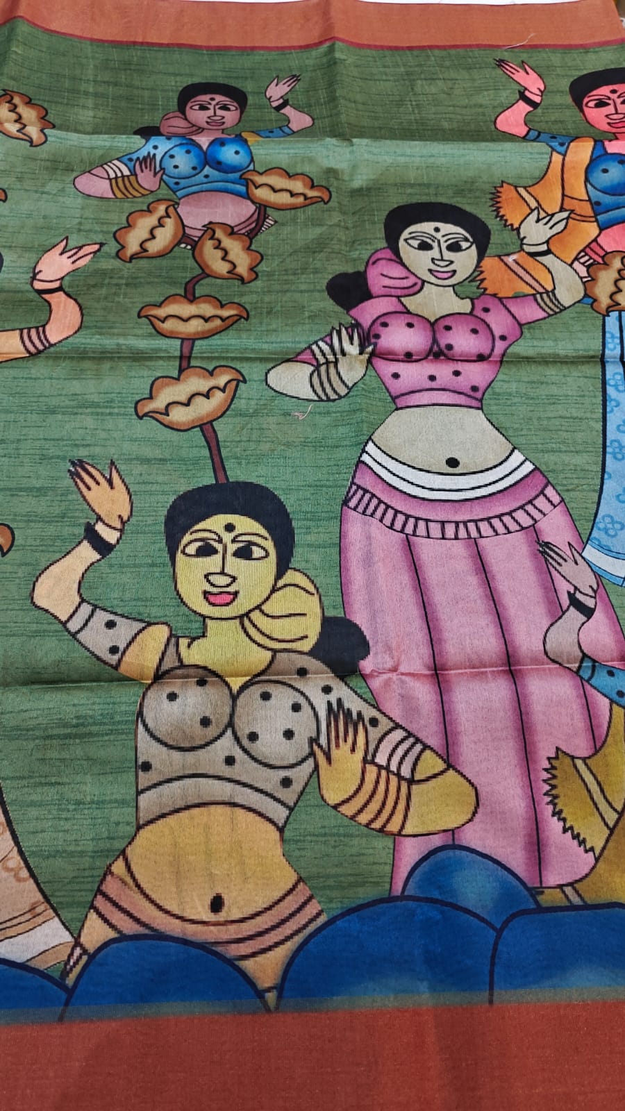 Kosa Semi Silk Saree Green And Maroon With Madhubhani Digital