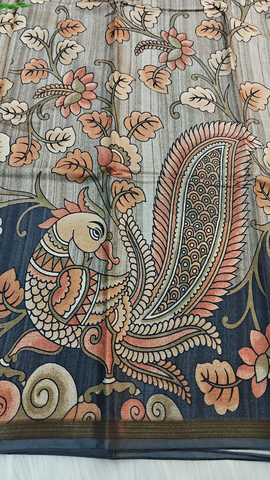 A graceful blend of tradition and modern elegance, Fabric is Soft, flowy Kia silk with a smooth texture and light sheen. Refreshing wisp grey—soothing and stylish. Traditional Kalamkari prints motifs are featuring floral, peacock, or mythological patterns in earthy tones. Lightweight and easy to drape—perfect for festive days, office parties, or casual gatherings.