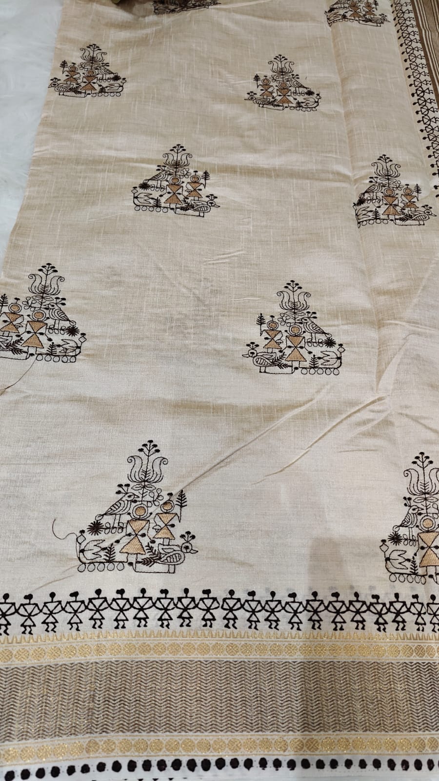 Pearl White Semi Tussar Silk With Black & Gold Zari Kantha Embroidery Work